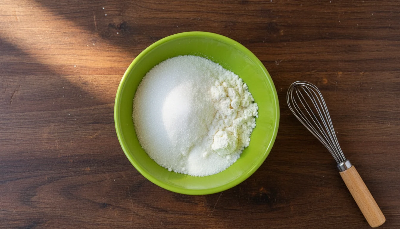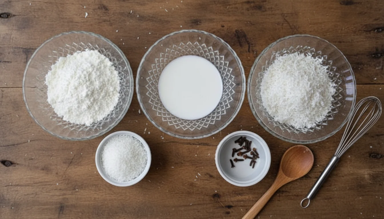 - Em uma tigela, coloque o leite em pó, o coco ralado e o leite de coco;