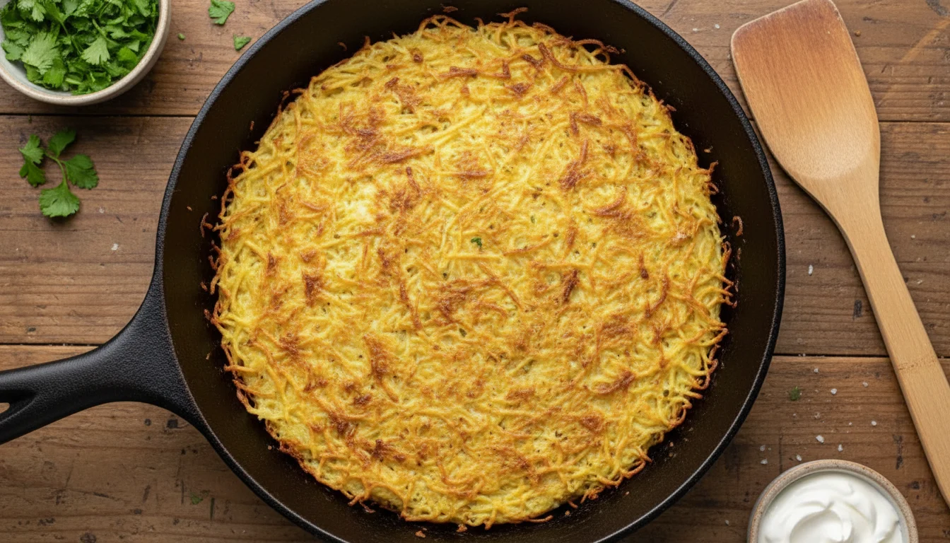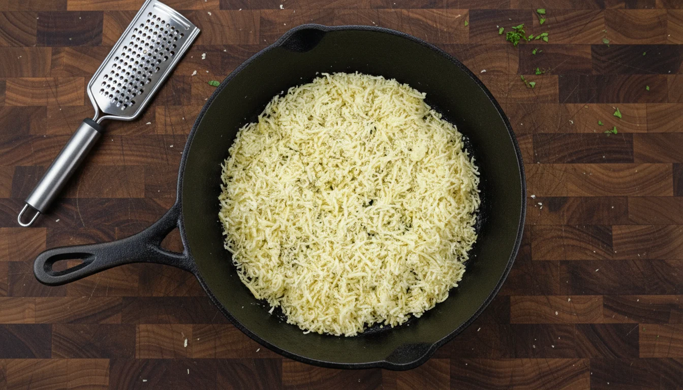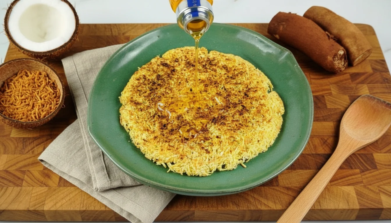 - Aqueça uma frigideira grande em fogo baixo. Adicione a mistura de mandioca temperada na frigideira e espalhe uniformemente, pressionando levemente para que fique homogênea.