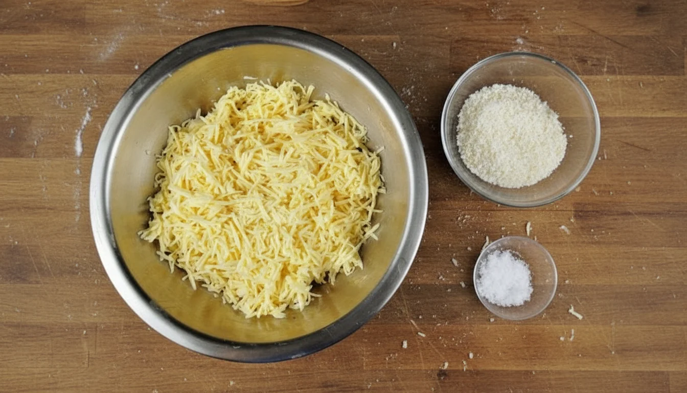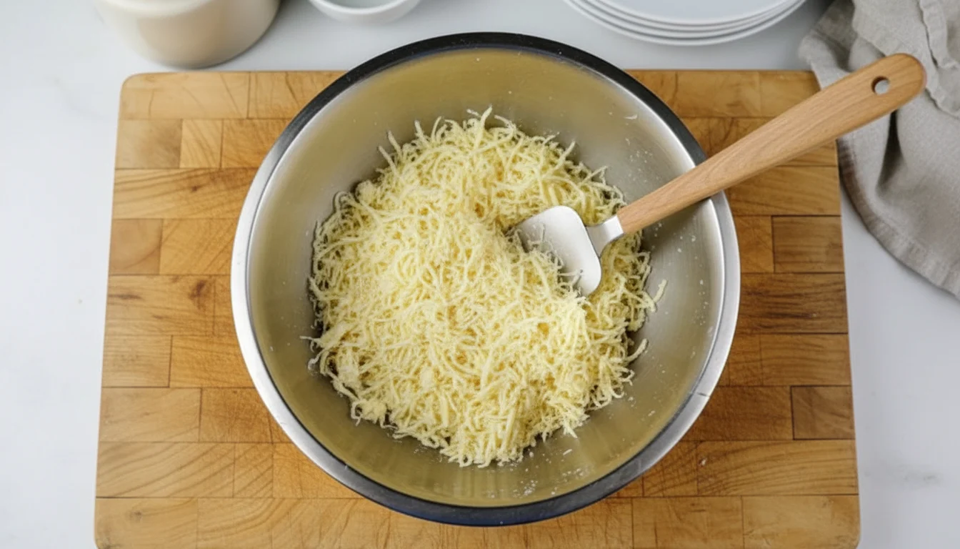 - Comece ralando a mandioca finamente sobre uma superfície limpa. Reserve.
