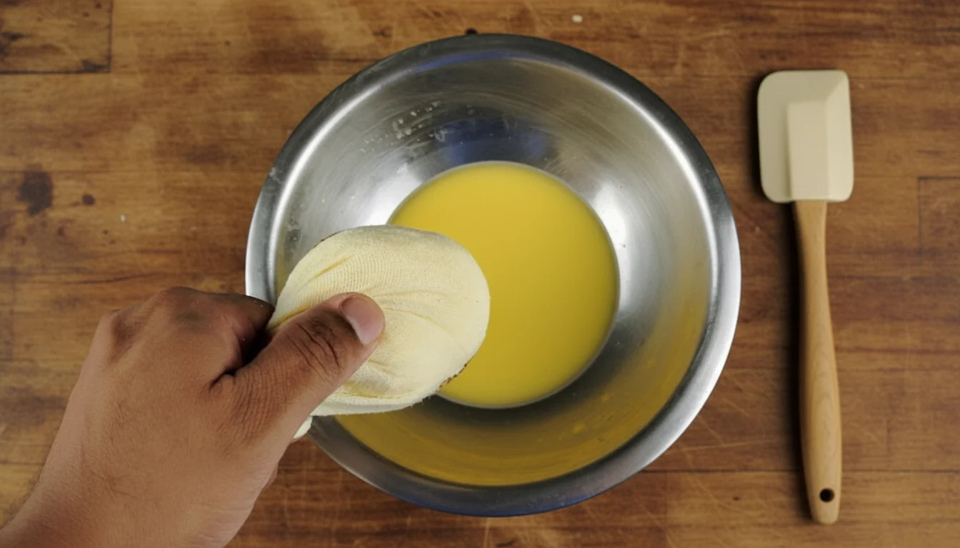 - Depois, coloque um pano de prato limpo dentro de um bowl, com as bordas para fora. Adicione a mandioca ralada ao centro do pano e aperte bem, esprema para remover o líquido excedente.