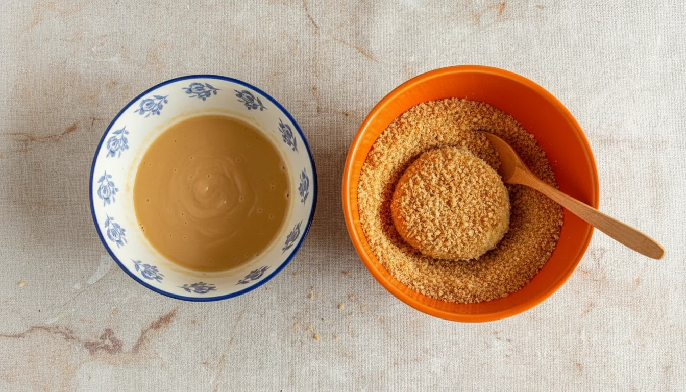 - Mergulhe cada rodela de berinjela na mistura de ovo e em seguida na farinha panko, pressionando suavemente;