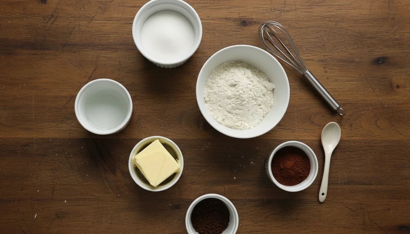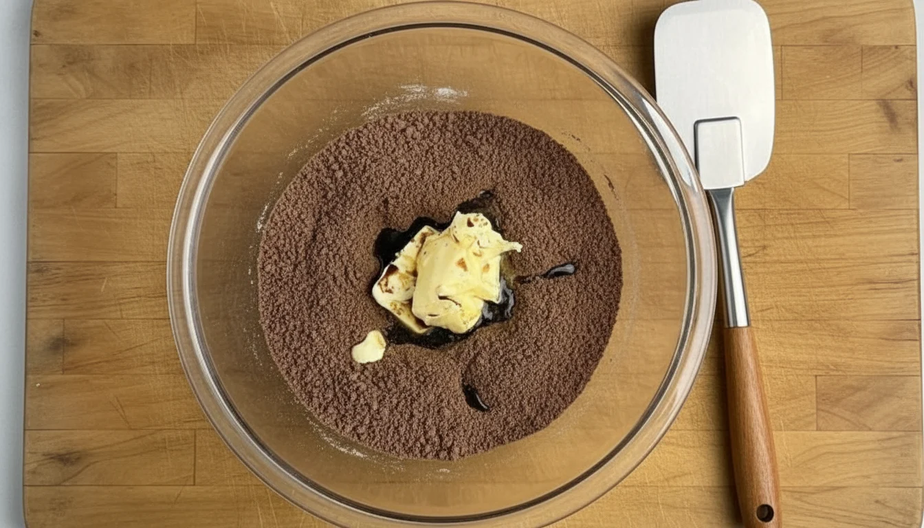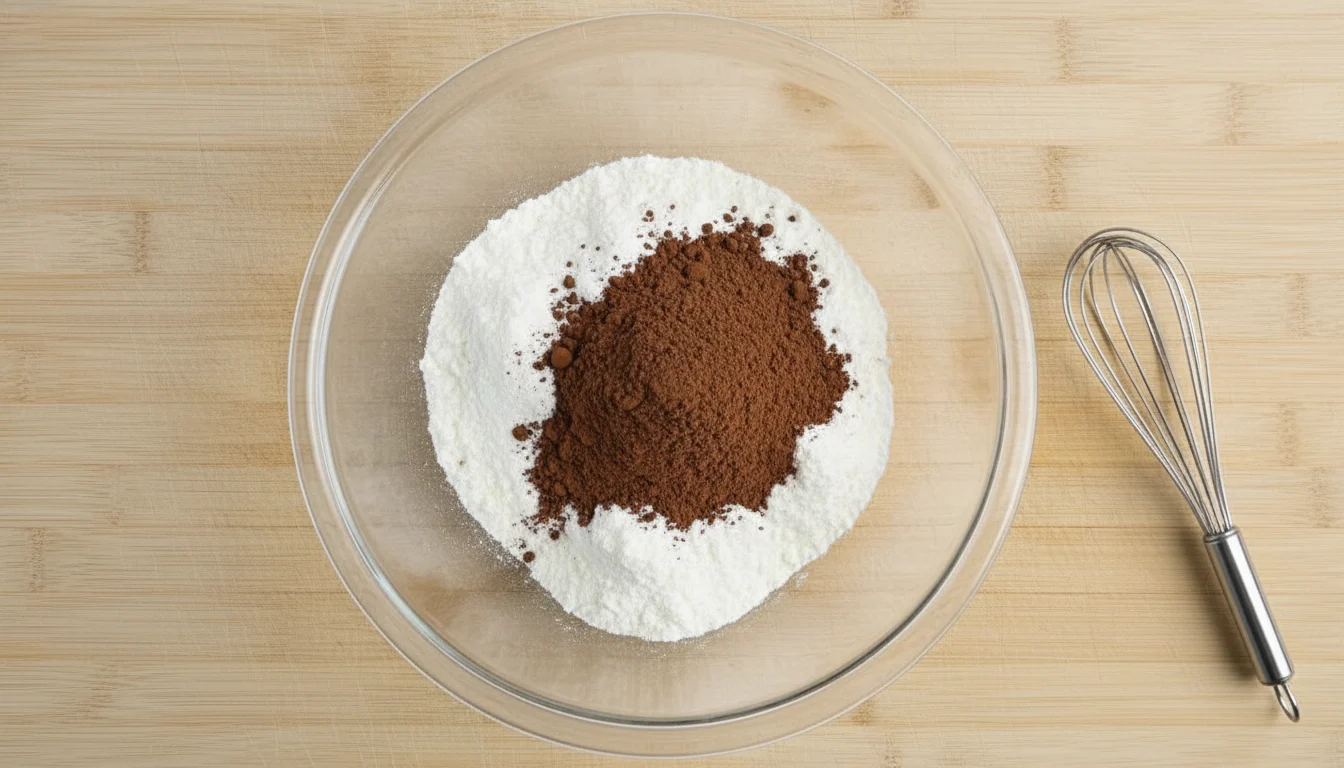 - Em um recipiente, coloque os ingredientes secos: farinha de trigo, açúcar e chocolate em pó. Misture bem com uma espátula até que fiquem homogêneos.