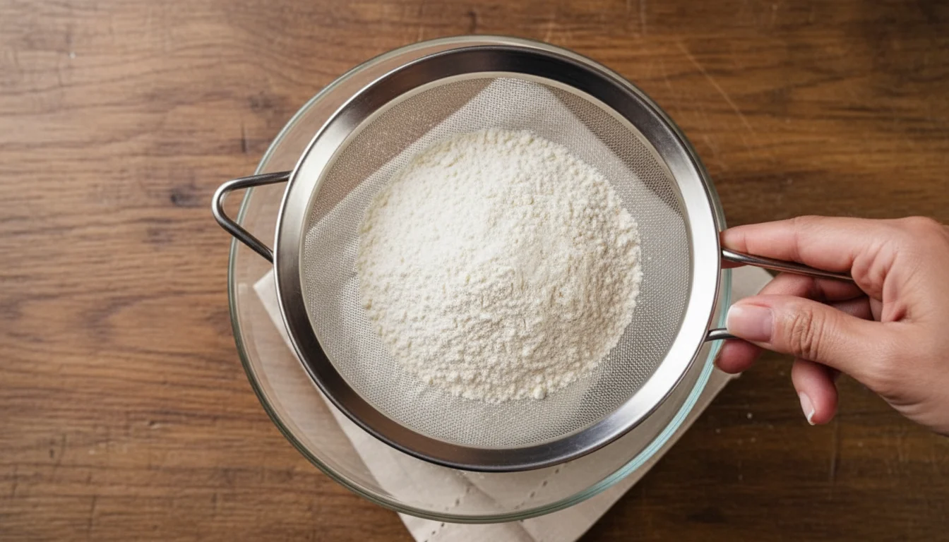 - Coloque uma peneira sobre a tigela e adicione a farinha, o sal e o fermento. Bata levemente para garantir que não haja grumos nos ingredientes secos.