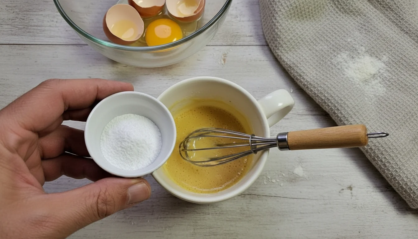 - Em uma caneca grande, insira o ovo, o sal e a essência de baunilha. Misture tudo com um garfo.