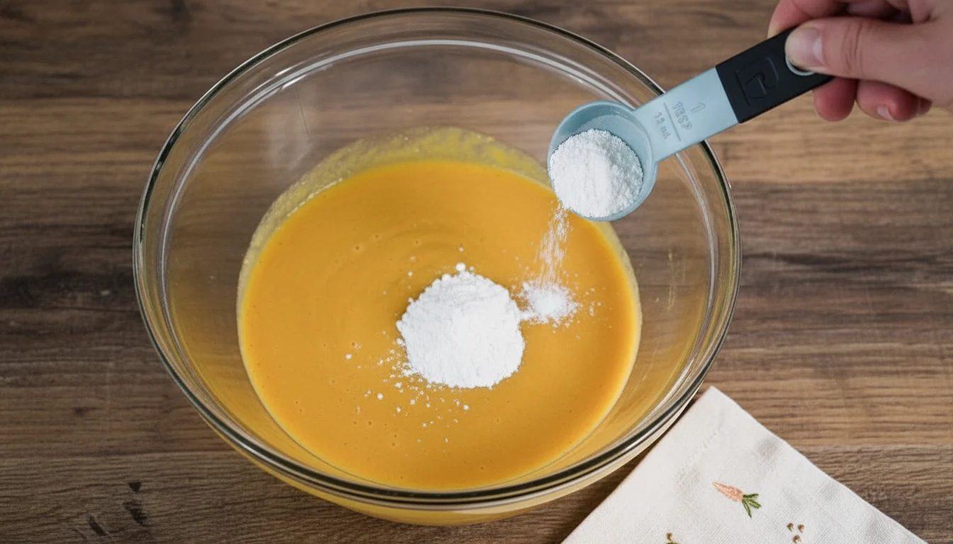 - Transfira a mistura do liquidificador para uma tigela grande. Adicione a farinha aos poucos, mexendo bem entre cada adição. Acrescente o amido de milho e misture até que não haja grumos. Adicione o fermento e misture suavemente para integrar.