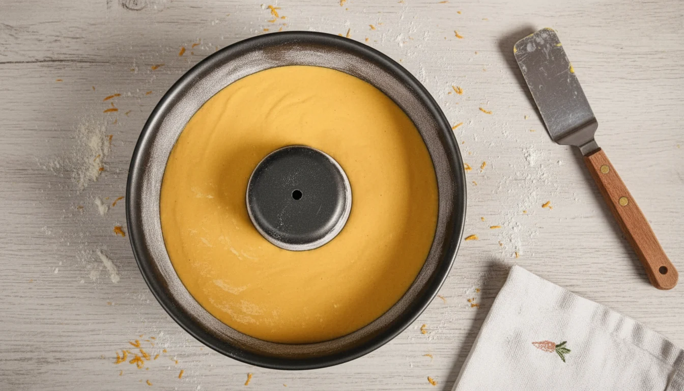 - Despeje a massa na forma previamente untada e enfarinhada. Coloque no forno aquecido e asse por aproximadamente 40 minutos, ou até que um palito inserido no centro saia limpo.