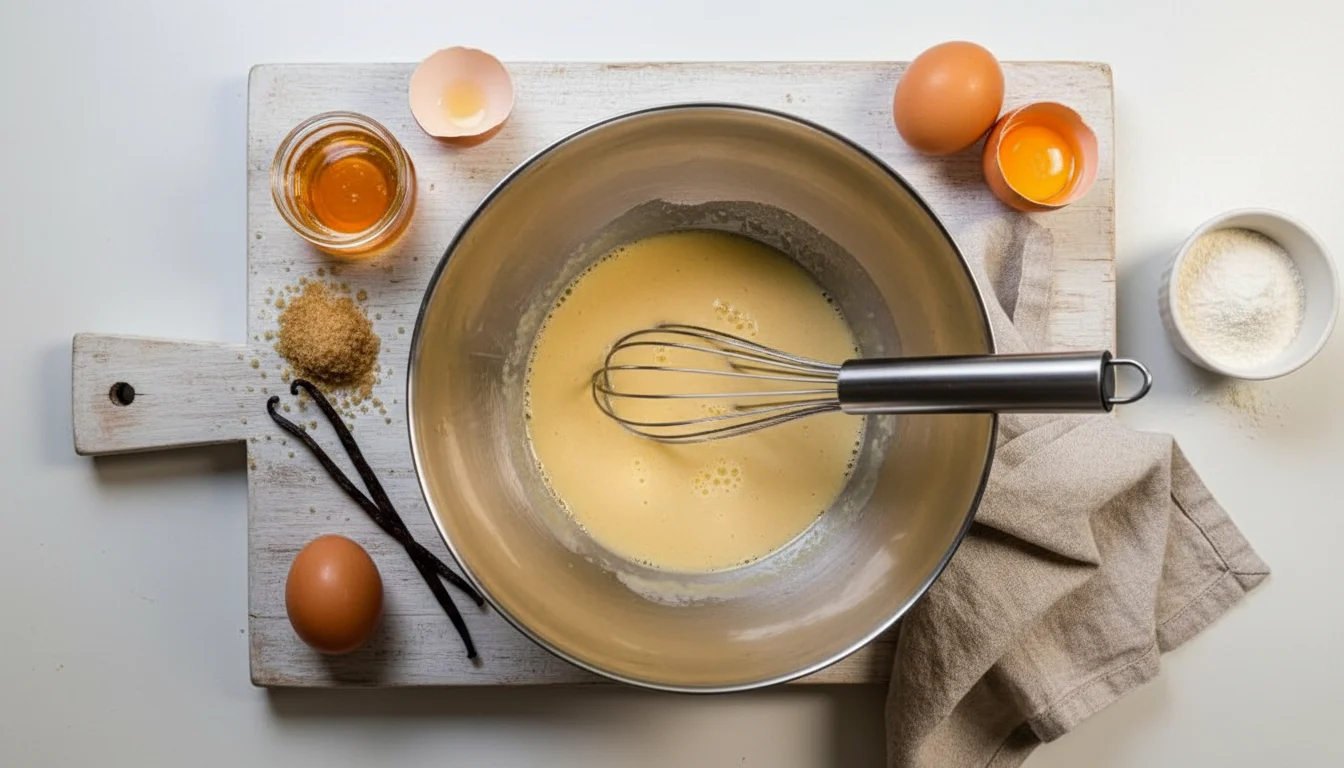 2. Em uma tigela espaçosa, coloque os ovos, adicione o açúcar peneirado e o óleo, e misture tudo com um fouet (batedor de arame) até obter uma mistura homogênea.