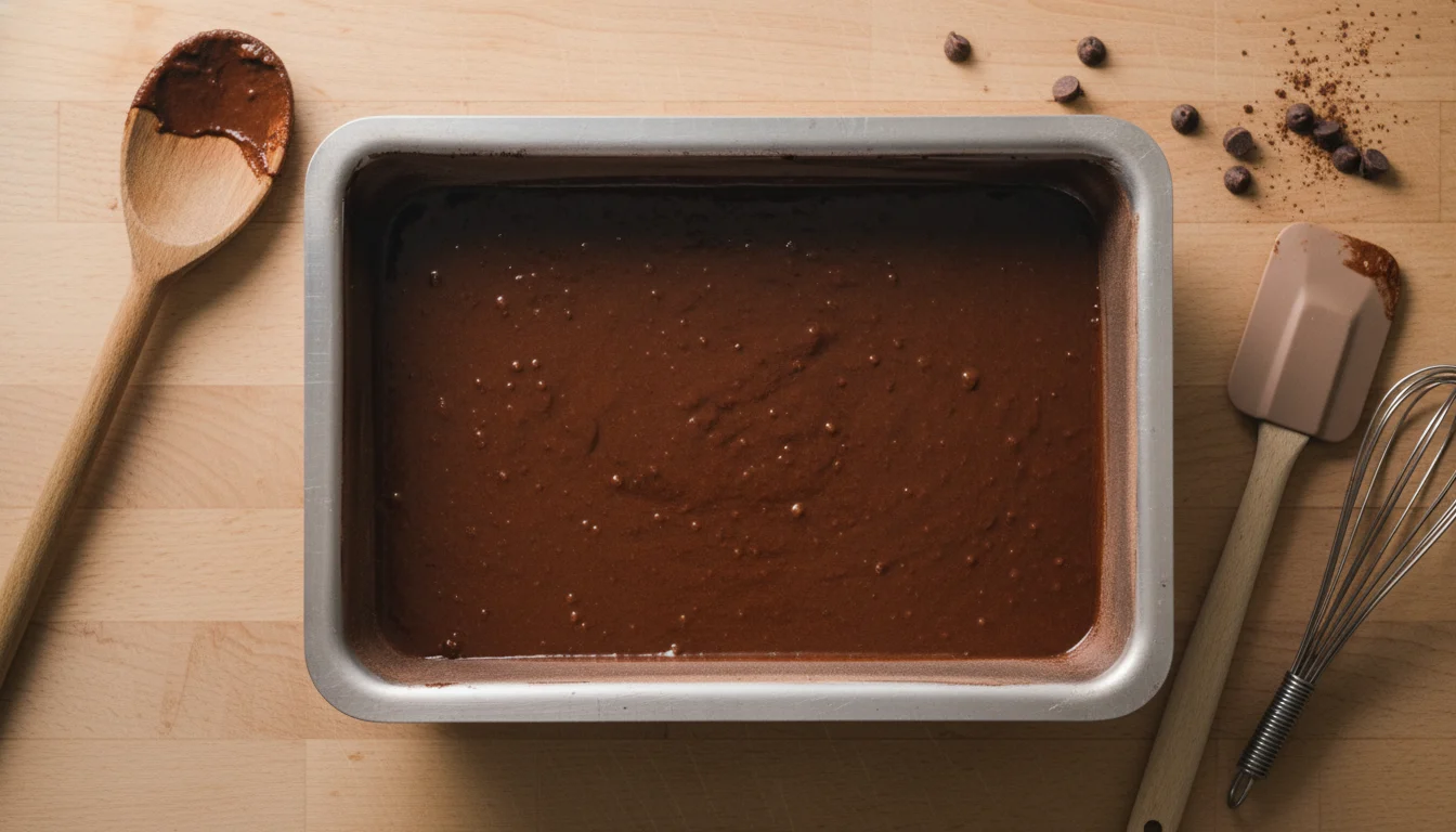 5. Transfira a massa para uma forma previamente untada e enfarinhada (manteiga, farinha de trigo e cacau em pó), com dimensões de 18 x 27 cm.