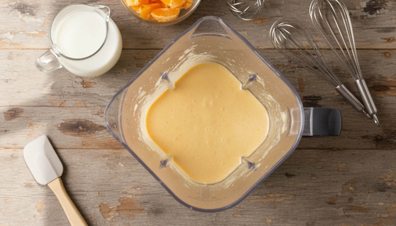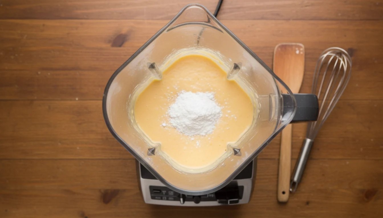 - Coloque os ovos, o óleo, o açúcar, os pedaços de laranja e a farinha de trigo no liquidificador. Misture por aproximadamente 2 minutos até obter uma massa bem homogênea.