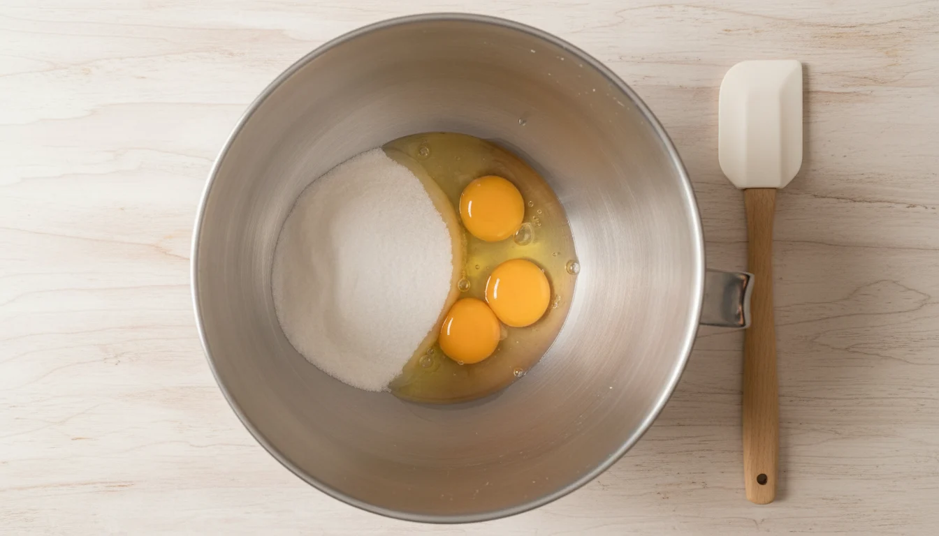 - Quebre os ovos individualmente em um recipiente pequeno e coloque-os na tigela da batedeira. Adicione o açúcar e bata até obter uma mistura homogênea.