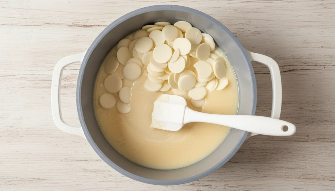 - Enquanto o bolo assa, prepare o recheio. Corte o chocolate branco em pedaços pequenos ou utilize gotas. Em uma panela média, coloque o leite condensado, o creme de leite e o chocolate branco.