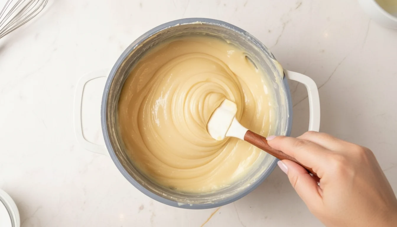 - Aqueça a panela em fogo baixo e mexa até obter um creme liso que desgrude do fundo da panela. Adicione o cream cheese e misture bem. Desligue o fogo, transfira o creme para uma tigela e cubra com filme plástico em contato para esfriar.