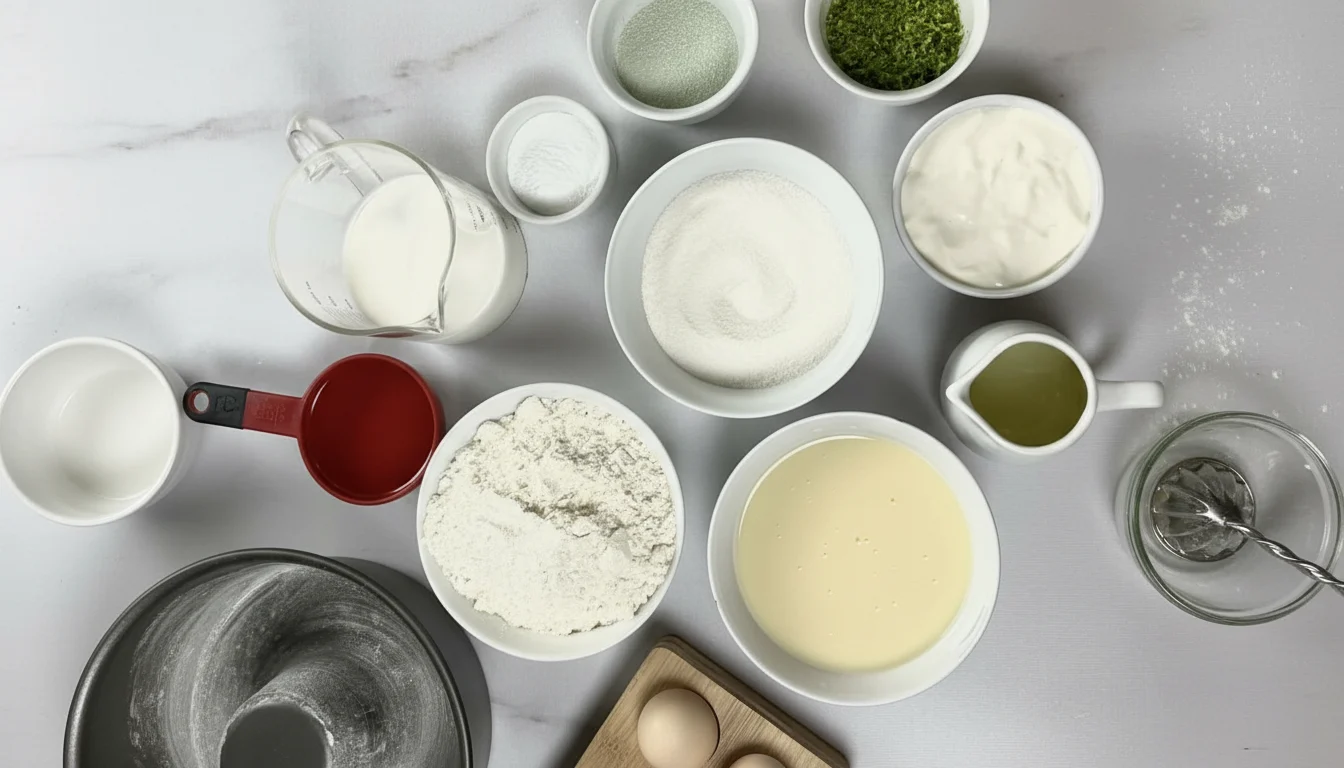1. Organize todos os ingredientes necessários para preparar o bolo verde. Preaqueça o forno a 180ºC, unte uma forma redonda de 20 cm com manteiga e polvilhe farinha.