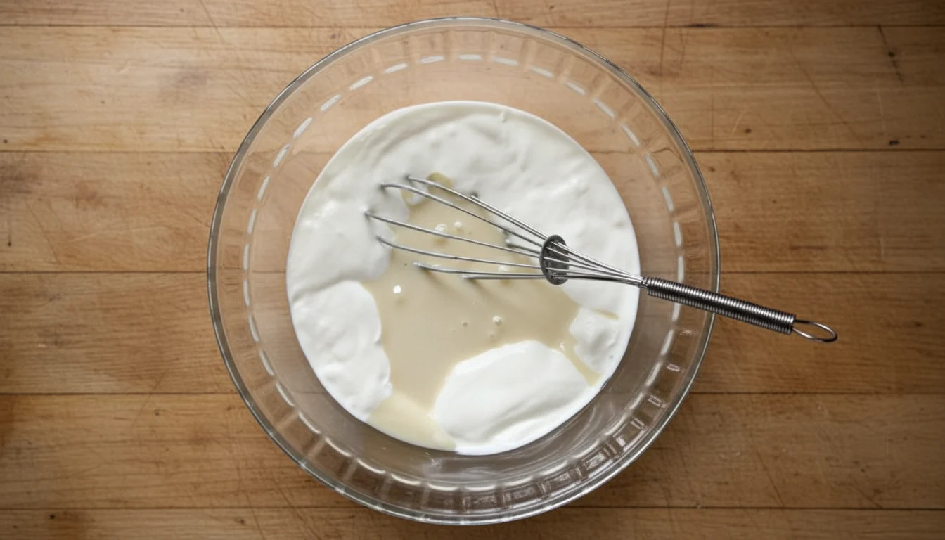 6. Para fazer a cobertura, coloque o leite condensado em uma tigela e adicione o creme de leite. Misture até ficar homogêneo.