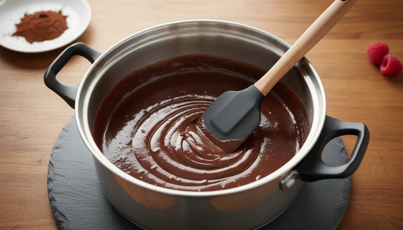 - Em uma panela grande, ainda fora do fogo, coloque o leite condensado, chocolate em pó e o creme de leite. Misture bem com uma espátula até obter uma mistura homogênea.