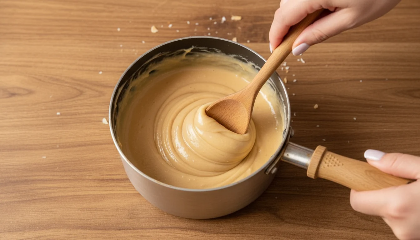 - Em uma panela média, fora do fogo, coloque o leite condensado, a manteiga e a gema de ovo. Misture bem a gema e a manteiga, depois leve ao fogo baixo, mexendo constantemente por aproximadamente 10 minutos ou até que a mistura desgrude do fundo da panela.
