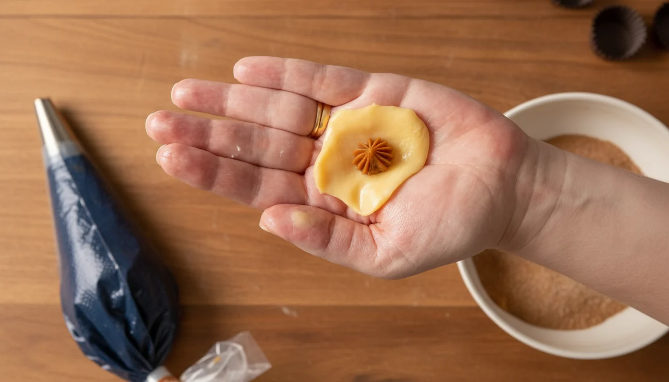 - Faça uma cavidade na bolinha e coloque o doce de leite no centro. Aperte o saco de confeiteiro com cuidado, sem exagerar, para que consiga fechar os brigadeiros com facilidade.