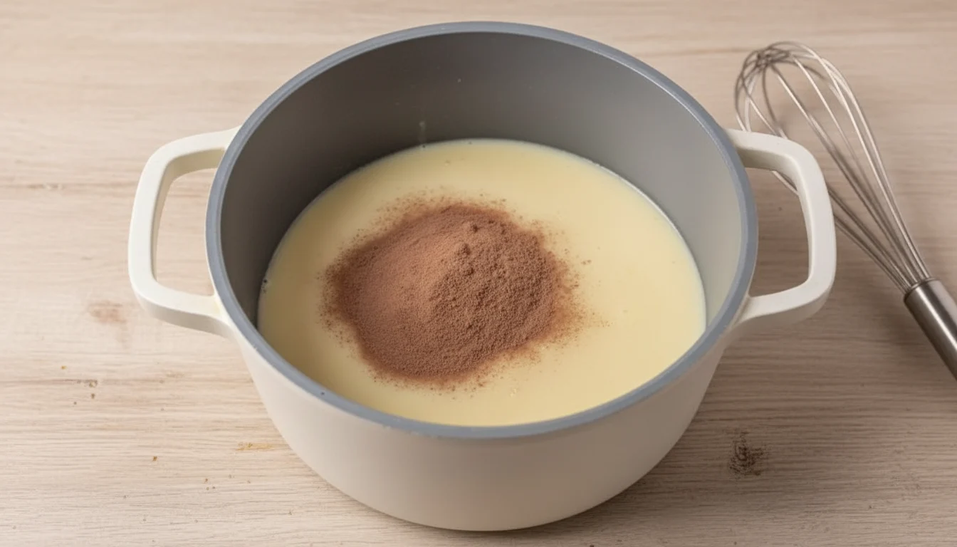 - Em uma panela, coloque o leite condensado e acrescente o achocolatado.