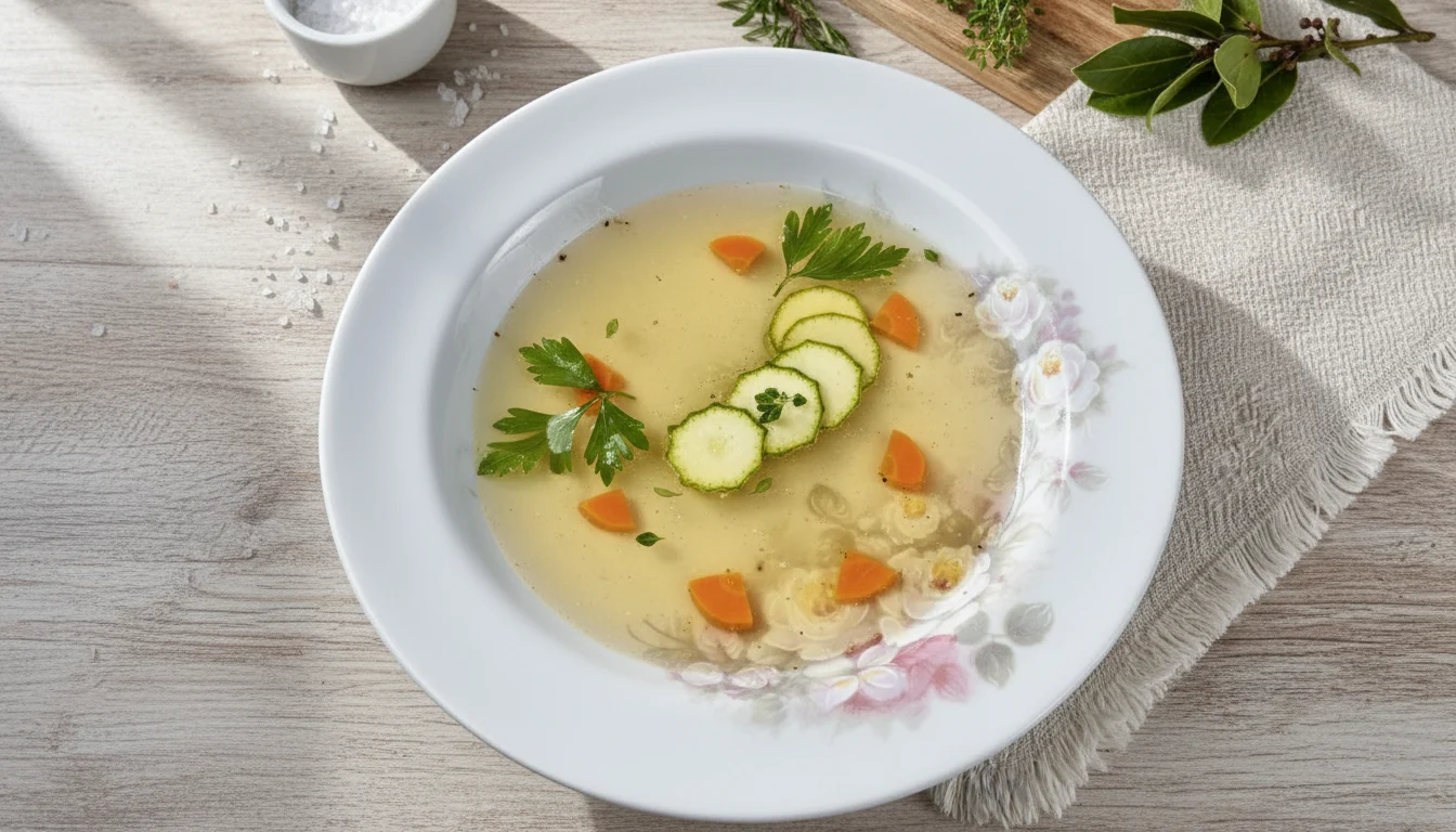- Sugestão de apresentação: corte a abobrinha em fatias bem finas. Em um prato, coloque as fatias de abobrinha, alguns pedaços da cenoura cozida no caldo e algumas folhinhas de salsinha. Despeje o caldo de carne por cima e sirva.