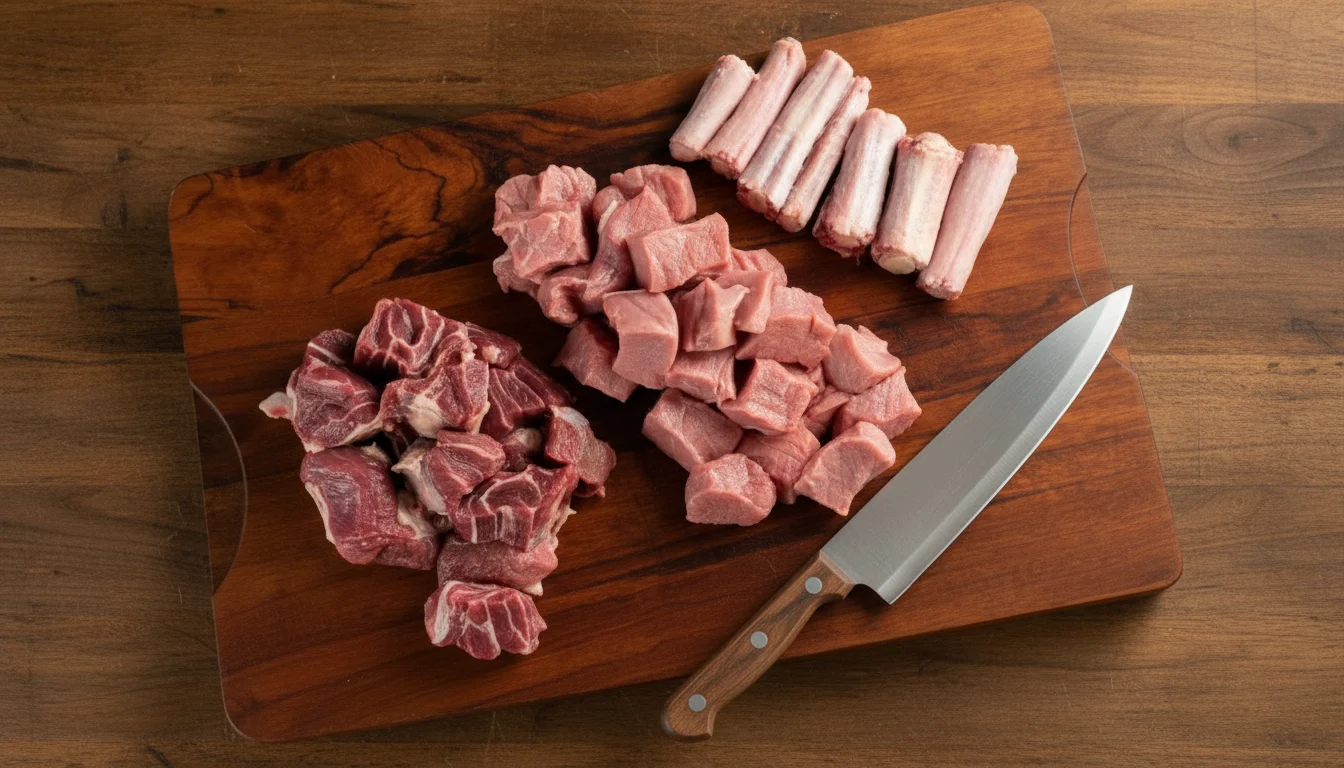 - Em uma superfície plana, corte o músculo e o coxão em pedaços médios, de aproximadamente 3 cm. A rabada deve ser adquirida já em pedaços pequenos para facilitar o cozimento.