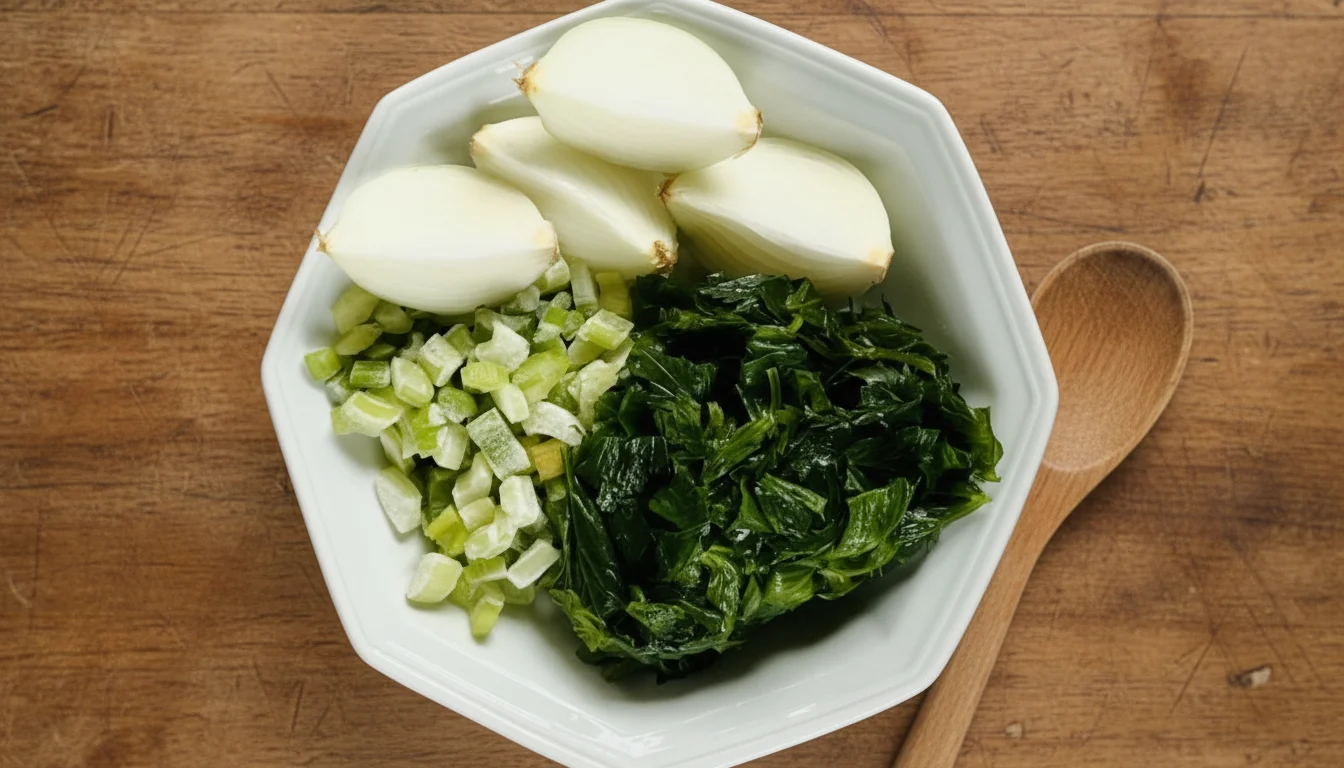 - Enquanto isso, prepare os legumes! Lave bem o salsão, cortando os talos e as folhas. Descasque e corte a cebola em cubos médios. Acrescente tudo na panela.