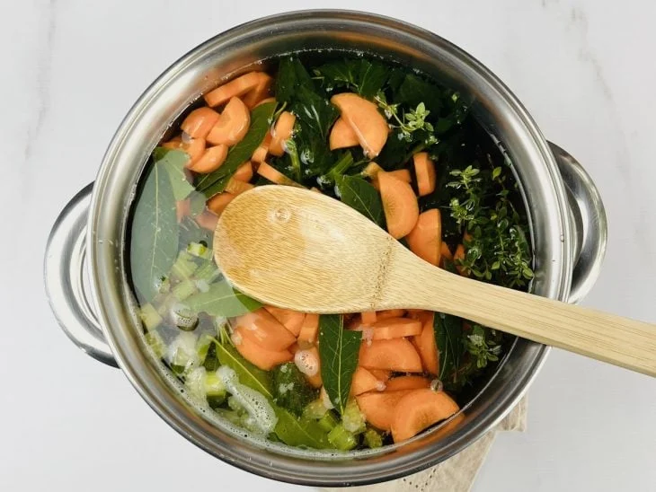- Descasque a cenoura, corte-a ao meio no sentido do comprimento e fatie em meias-luas. Adicione a cenoura, o tomilho, o alecrim, os grãos de pimenta-do-reino e as folhas de louro à panela. Misture bem para que todos os ingredientes fiquem submersos.