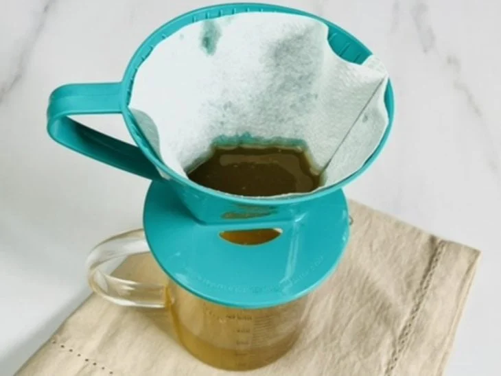 - Coe o caldo em um coador de voal ou um coador de café. Seja paciente nessa etapa, pois pode levar algum tempo. Nesse caso, levou cerca de 30 minutos.