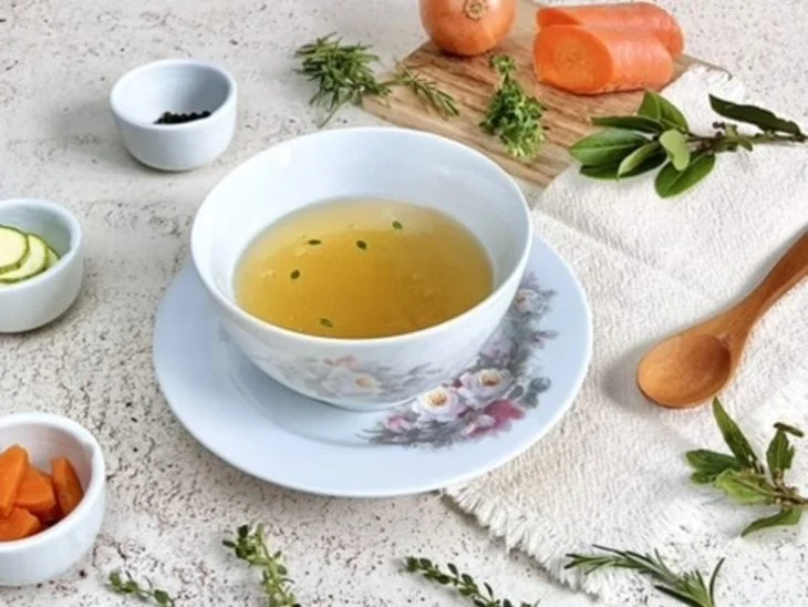 - Após coar, o líquido ficará claro e livre de impurezas. Finalize com ervas frescas de sua escolha. Utilizamos algumas folhinhas de tomilho. Reserve alguns pedaços de cenoura para servir junto com o caldo.