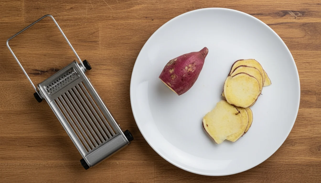 - As batatas-doces de casca rosa são ideais para esta receita. Um cortador de legumes (mandolim) é necessário para obter fatias finas e crocantes.