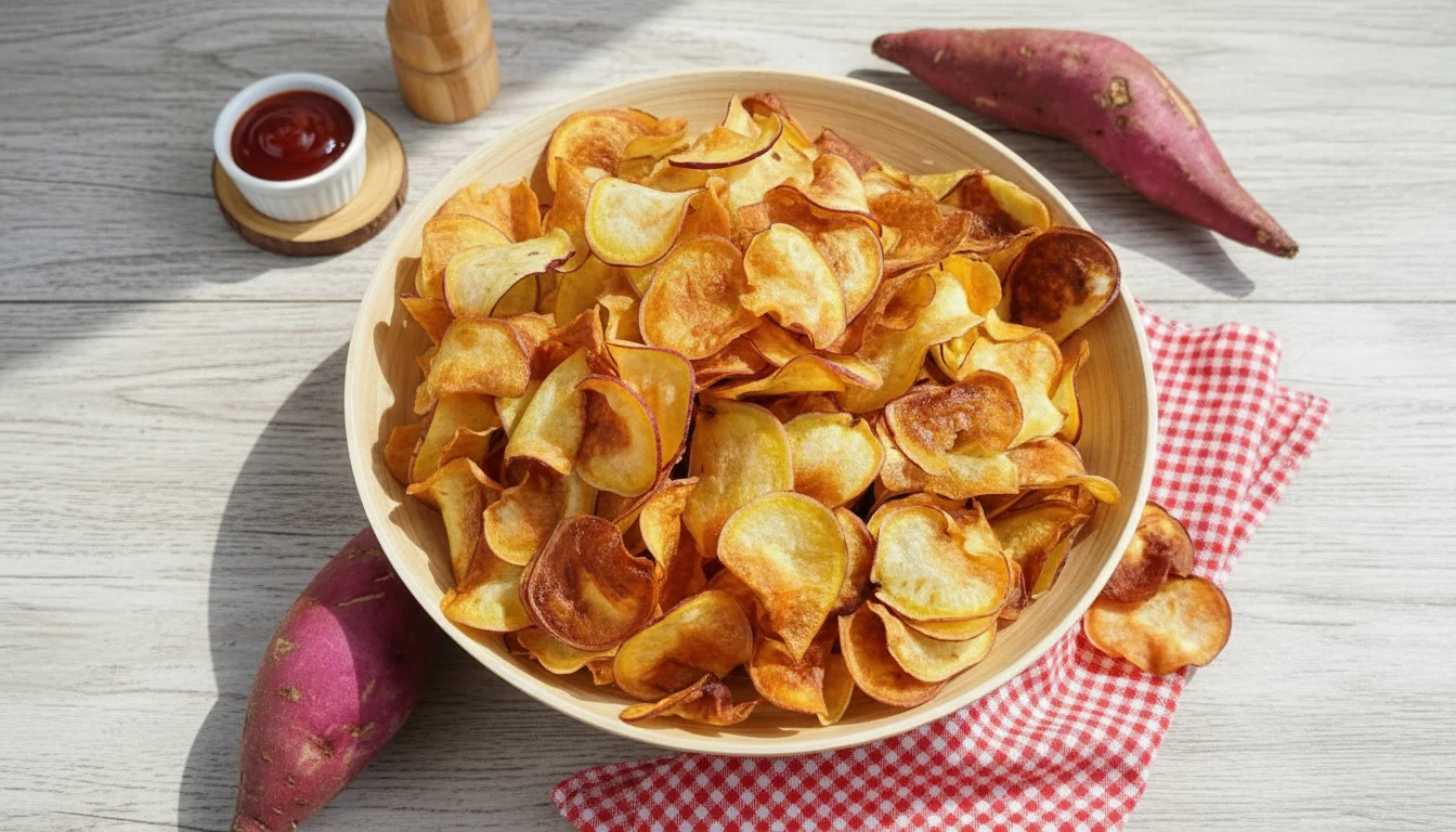 Hoje decidi experimentar algo diferente para meu lanche da tarde. Como sou apaixonada por batata-doce, pensei que seria incrível transformá-la em chips crocantes para acompanhar minha sessão de cinema. Sorte minha que tinha algumas batatas-doces sobrando na despensa e um desejo incontrolável de algo saboroso e saudável.