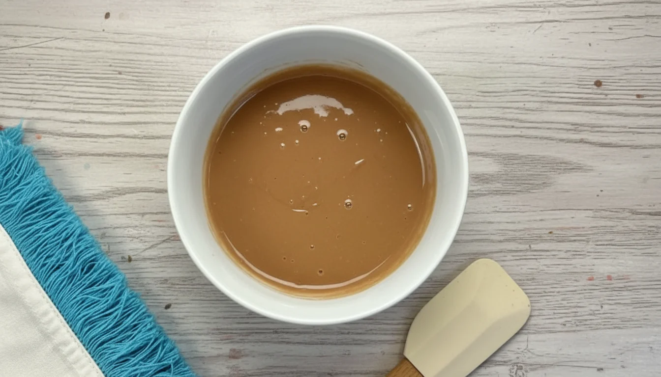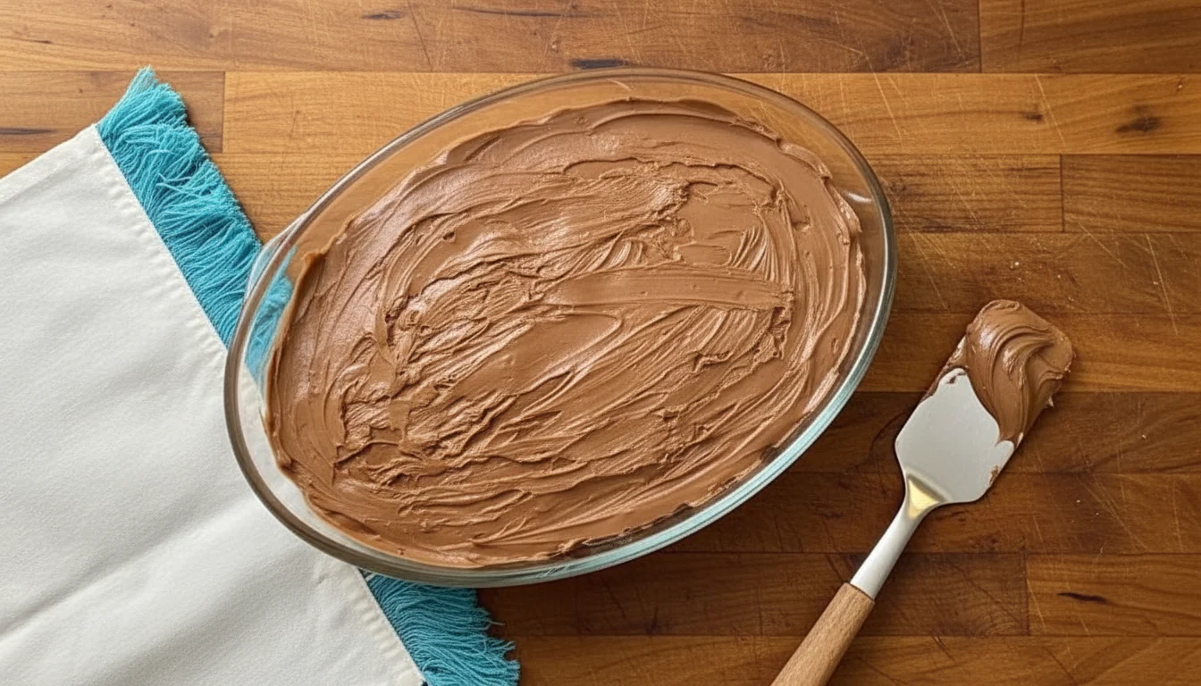 - Despeje o chocolate derretido sobre o creme e espalhe uniformemente. Em seguida, com uma espátula ou colher, faça movimentos circulares e suaves para misturar o chocolate com o creme na parte superior.