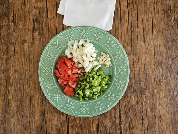 - Pique a cebola e o alho em cubos pequenos, descascando-os previamente. Lave, seque e corte o tomate em cubos. Retire as sementes e as partes brancas do pimentão, picando-o em pedaços pequenos.