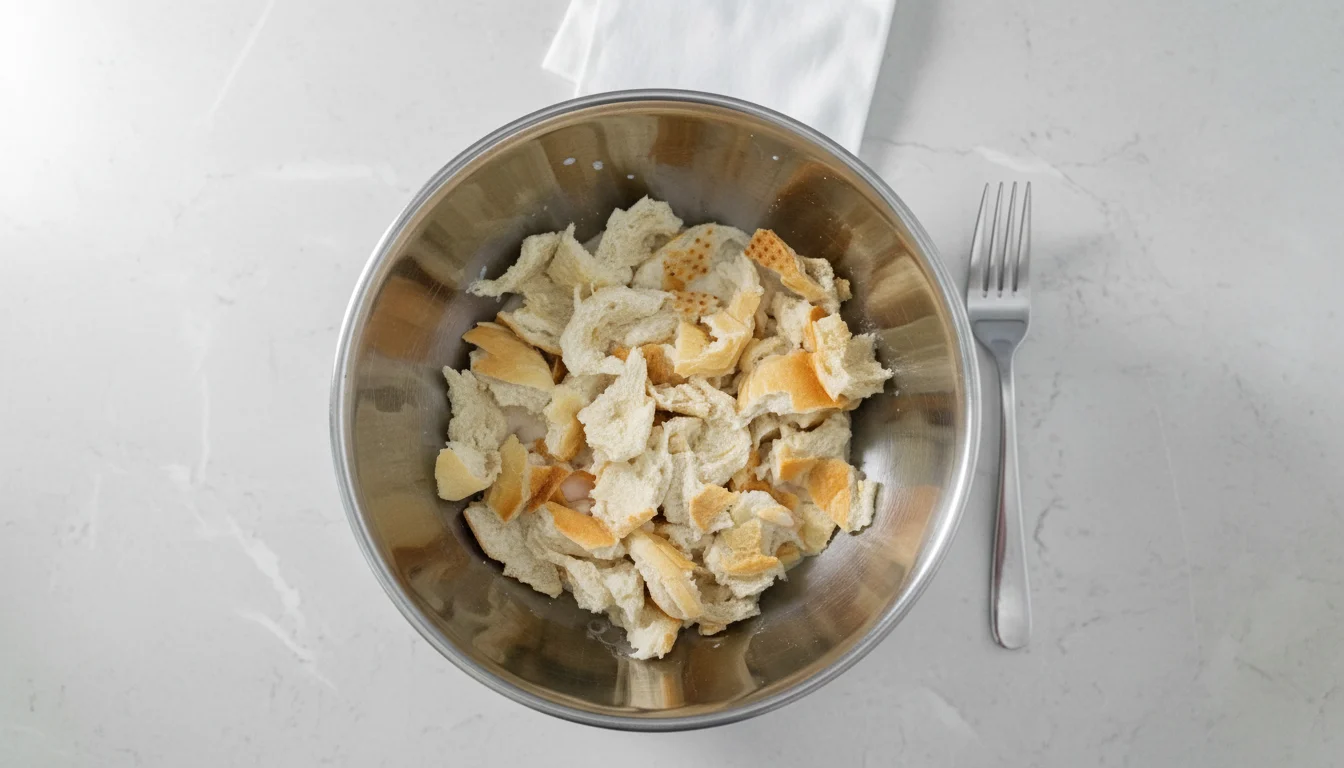 - Em uma tigela, use as mãos para quebrar os pães amanhecidos em pedaços menores. Adicione o leite e deixe os pães absorverem o líquido.