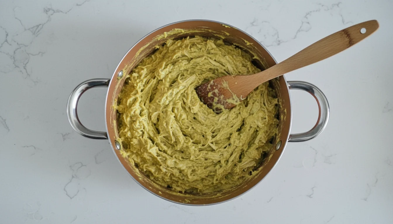 - Cozinhe o frango desfiado por cerca de 2 a 3 minutos, mexendo constantemente. Em seguida, acrescente a mistura do liquidificador e o leite de coco, mexendo até que tudo esteja bem incorporado e deixe ferver, mexendo ocasionalmente.