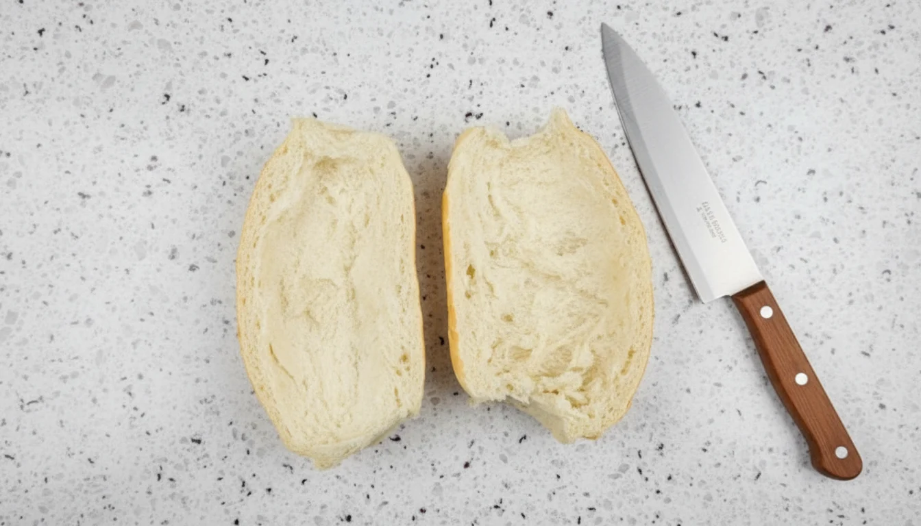- Corte o pão pela metade, horizontalmente. Com os dedos ou uma colher, pressione o miolo para criar uma cavidade mais profunda - se necessário, retire um pouco do miolo.