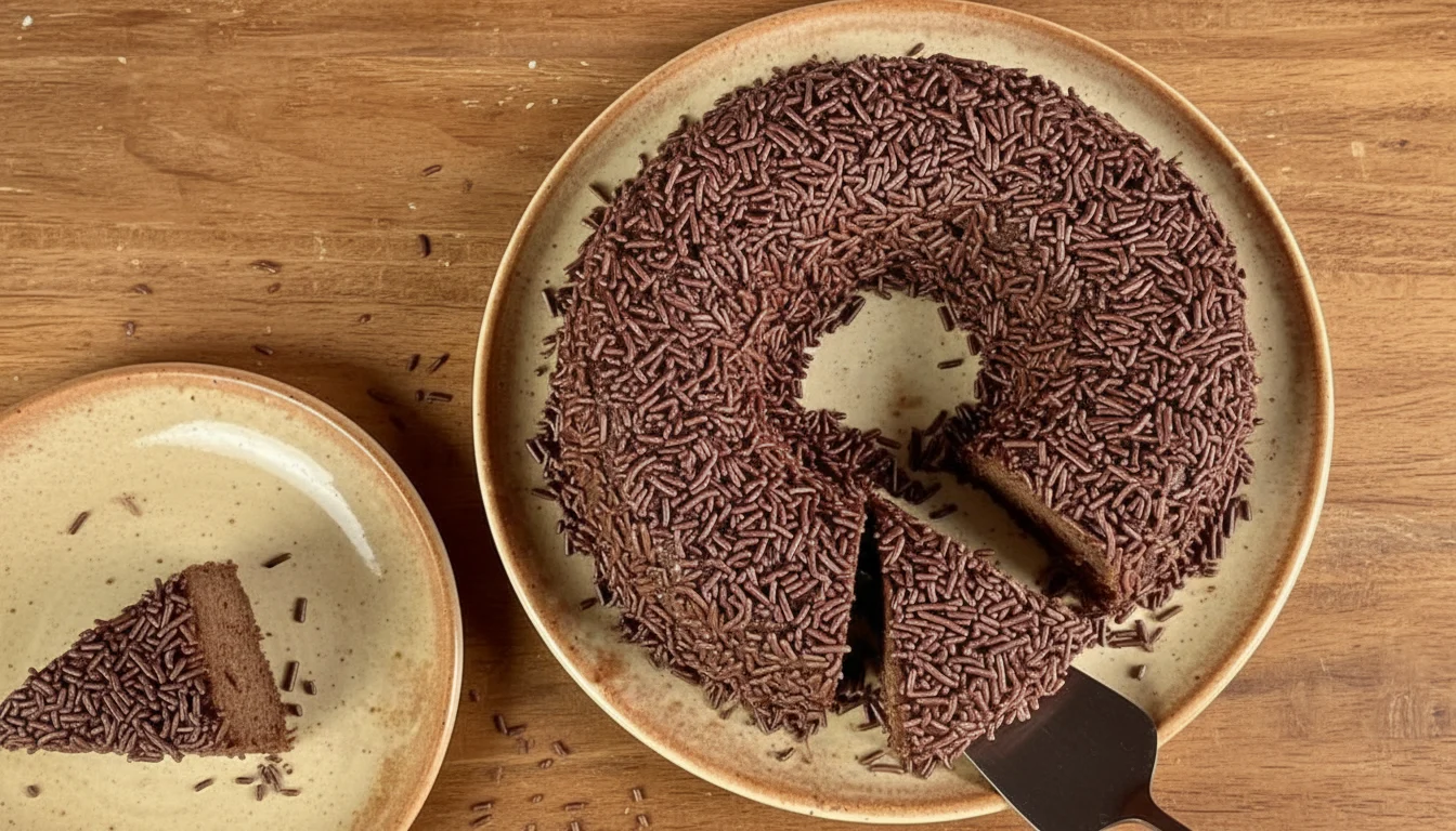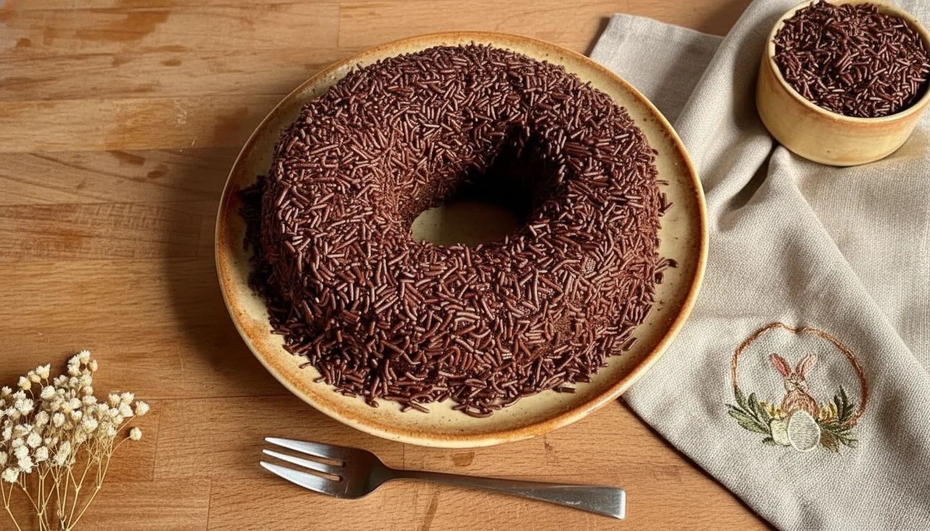- Deixe esfriar um pouco, desenforme e adicione o granulado por cima. Agora é só saborear essa sobremesa de chocolate que é super simples de fazer!