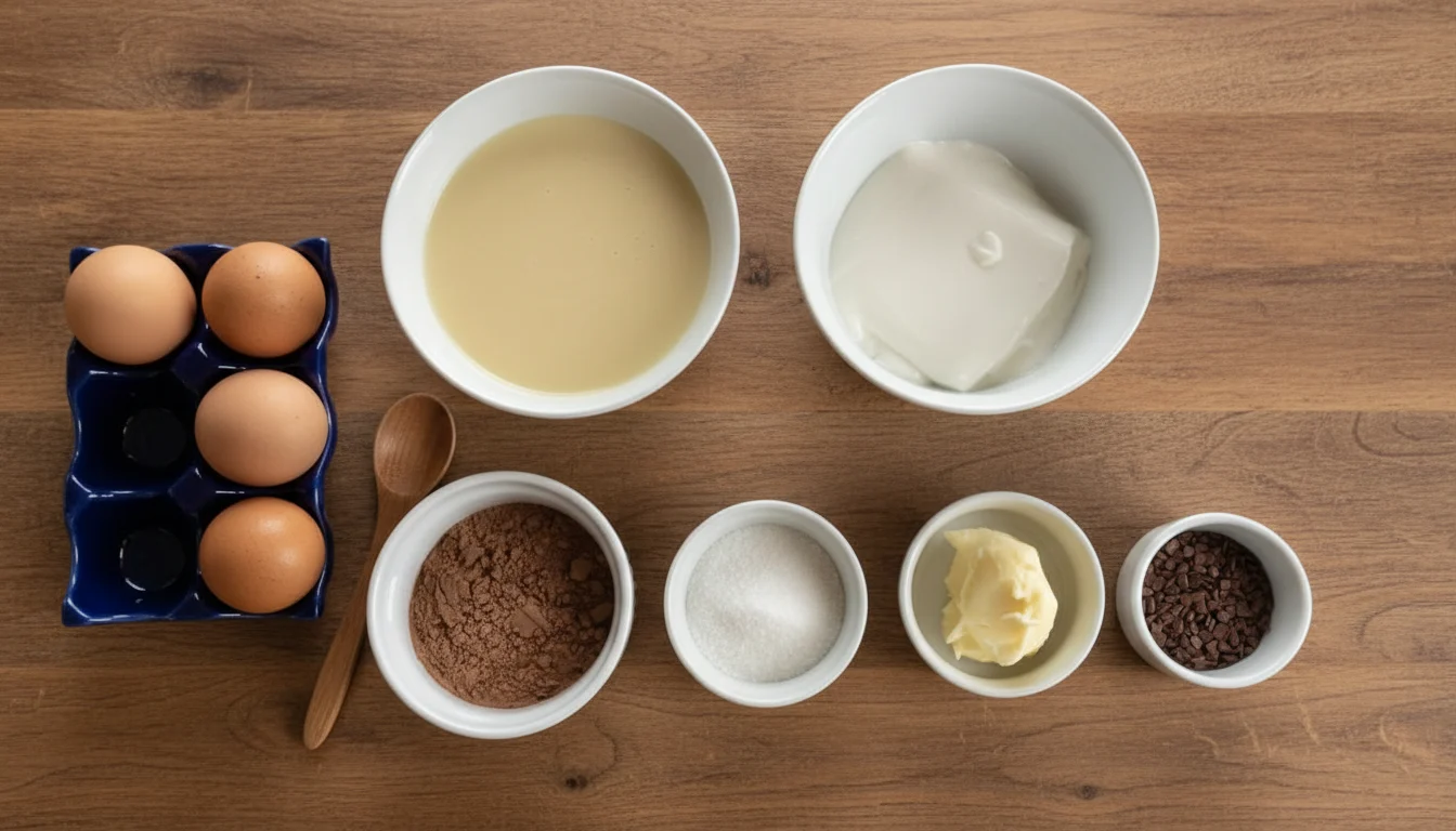 - Em uma tigela, quebre os ovos um a um e coloque-os no liquidificador. Adicione o leite condensado, o creme de leite, o cacau em pó, o açúcar e a manteiga. Misture tudo até obter uma mistura homogênea.