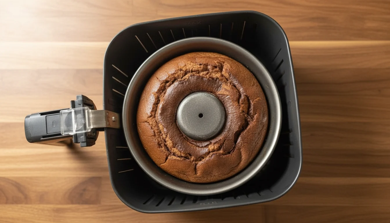 - Coloque a forma na air fryer pré-aquecida e asse por cerca de 25 minutos, ou até que o brigadeirão esteja firme. Após o tempo de cozimento, retire cuidadosamente a forma da air fryer.