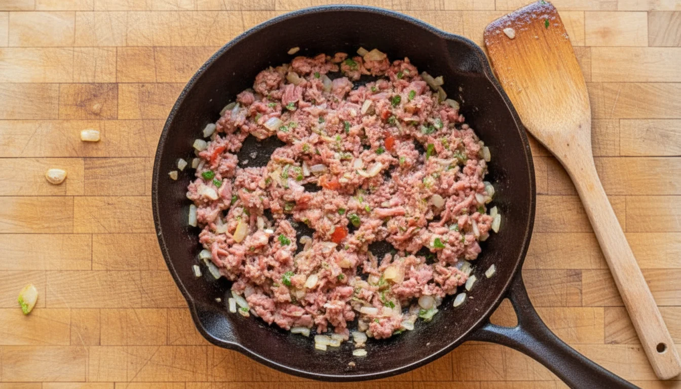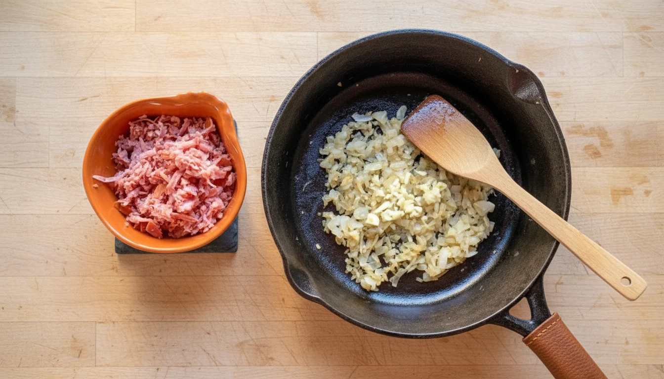 3. Enquanto a cebola refoga, use um ralador para ralar a linguiça calabresa. Assim que a cebola estiver dourada, acrescente o alho picado e continue mexendo até que ele esteja levemente frito;
