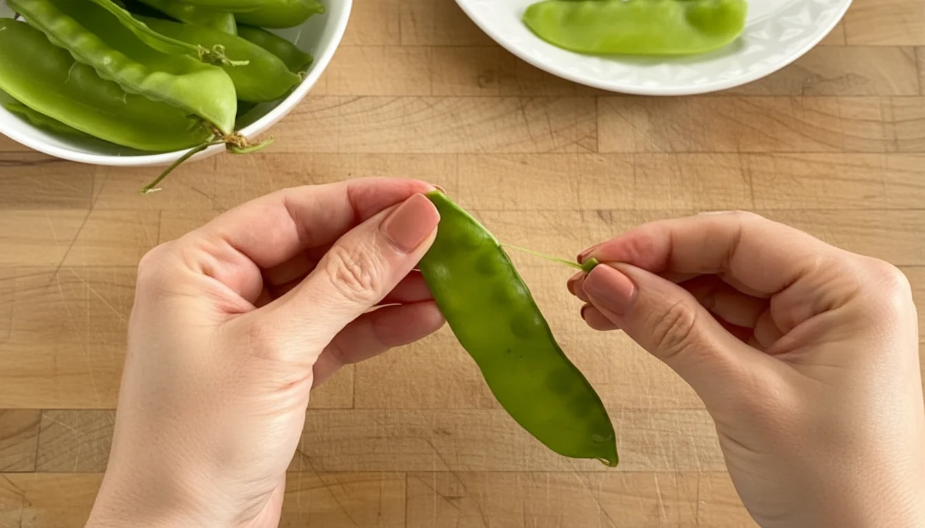 - Lave, desinfete e seque as ervilhas-tortas. Com as mãos ou uma faca de legumes, puxe a fibra principal pela ponta da ervilha e descarte-a.