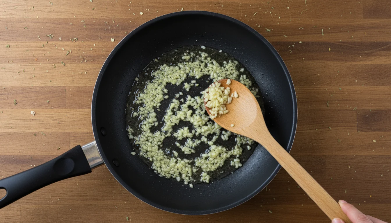 - Em uma panela ou frigideira em fogo médio, adicione a manteiga e deixe derreter. Após derretida, coloque a cebola e uma pitada de sal, fritando levemente. Depois, adicione o alho e refogue por mais um minuto.