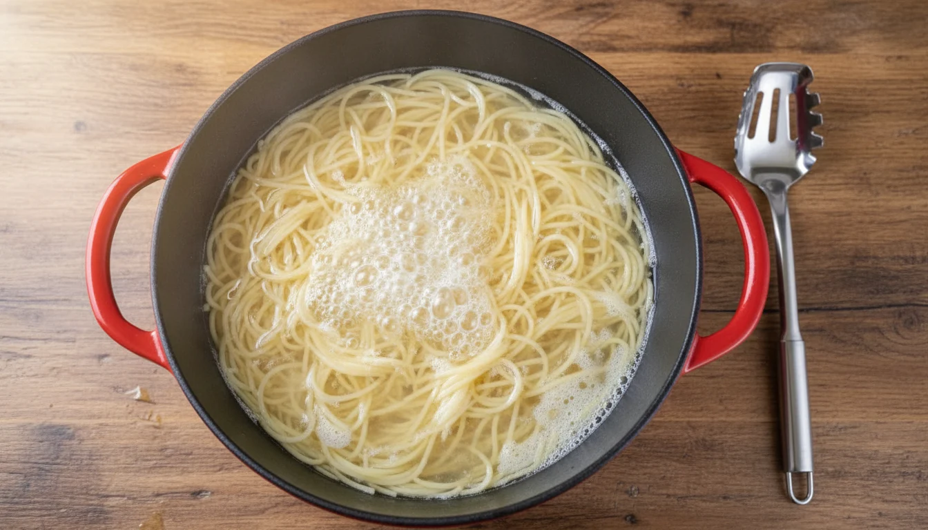 - Coloque uma panela com água em fogo médio, adicione o espaguete, um toque de sal e cozinhe até ficar al dente