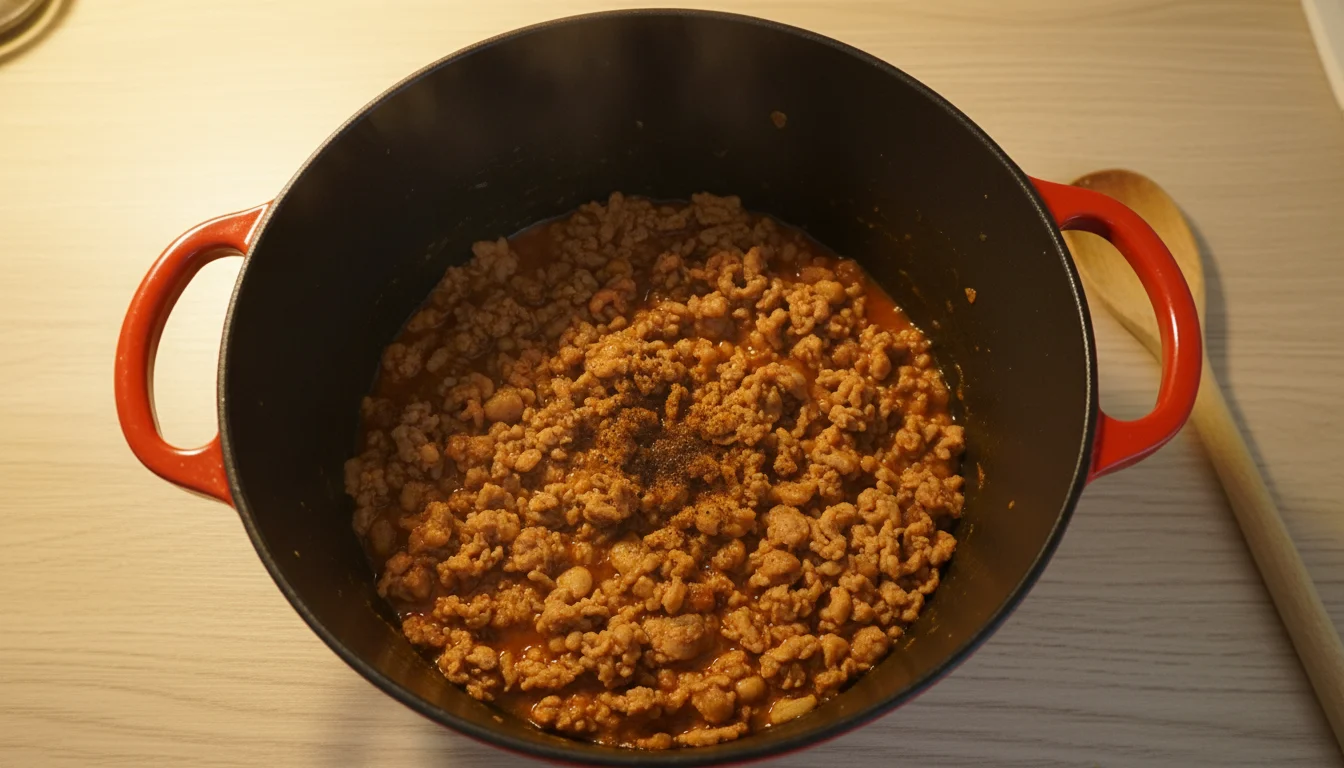 - Quando a linguiça estiver dourada, reduza o fogo, adicione o molho de tomate, o sal, a pimenta e misture bem