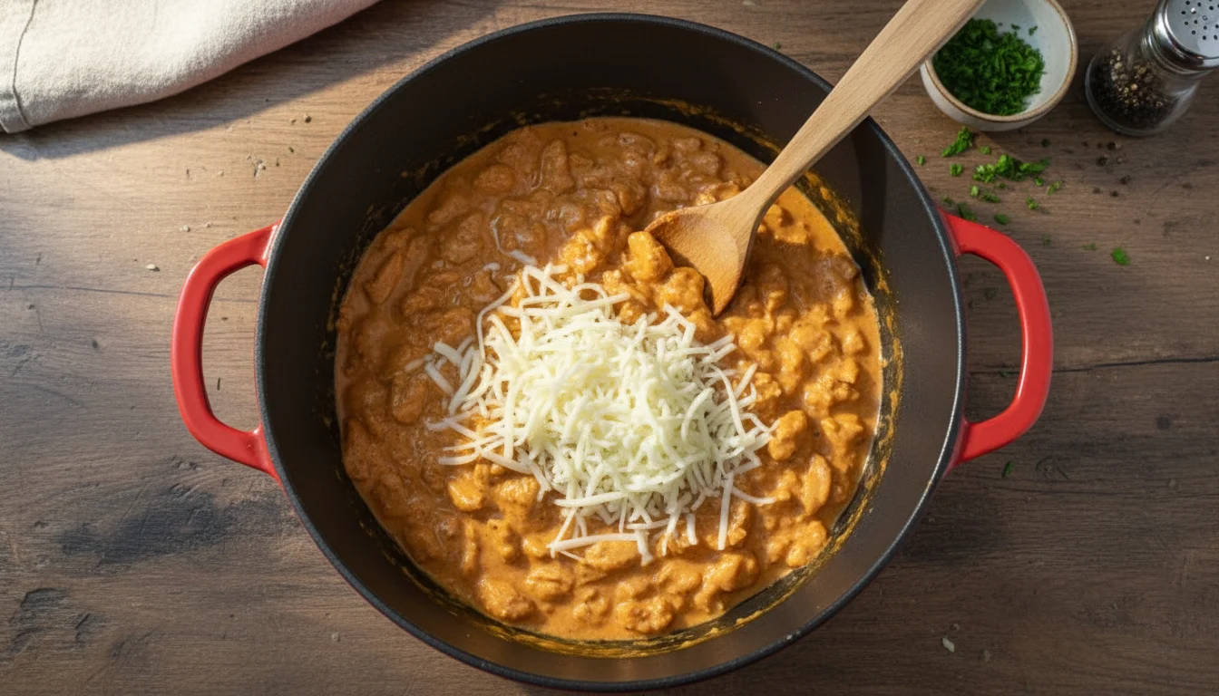 - Acrescente o queijo, misture bem e deixe o molho cozinhar por aproximadamente 2 minutos