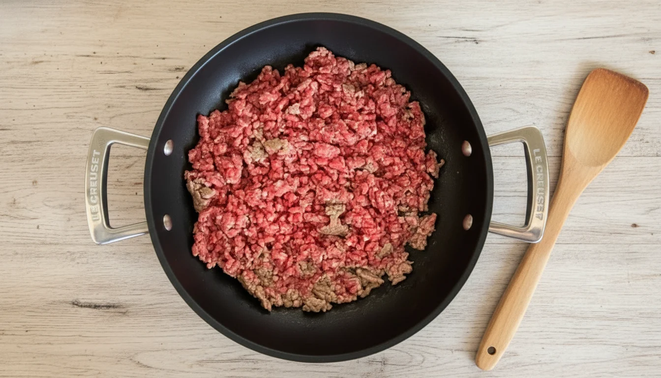 1. Em uma panela antiaderente, aqueça um fio de azeite em fogo médio. Acrescente a carne moída e refogue por cerca de 10 minutos, até que fique bem dourada, mexendo ocasionalmente.