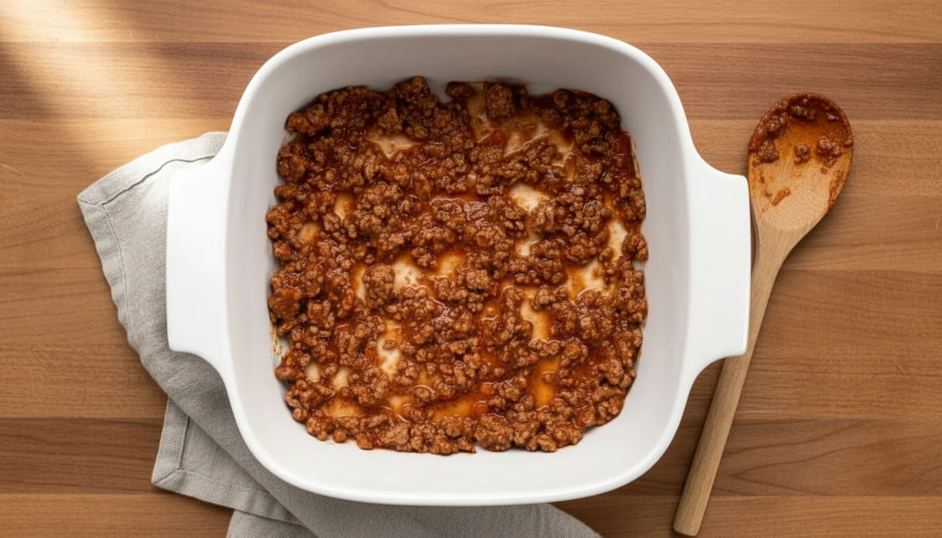 4. Para a montagem, em uma forma ou travessa, coloque uma camada generosa do molho de carne moída, espalhando bem para cobrir todo o fundo.