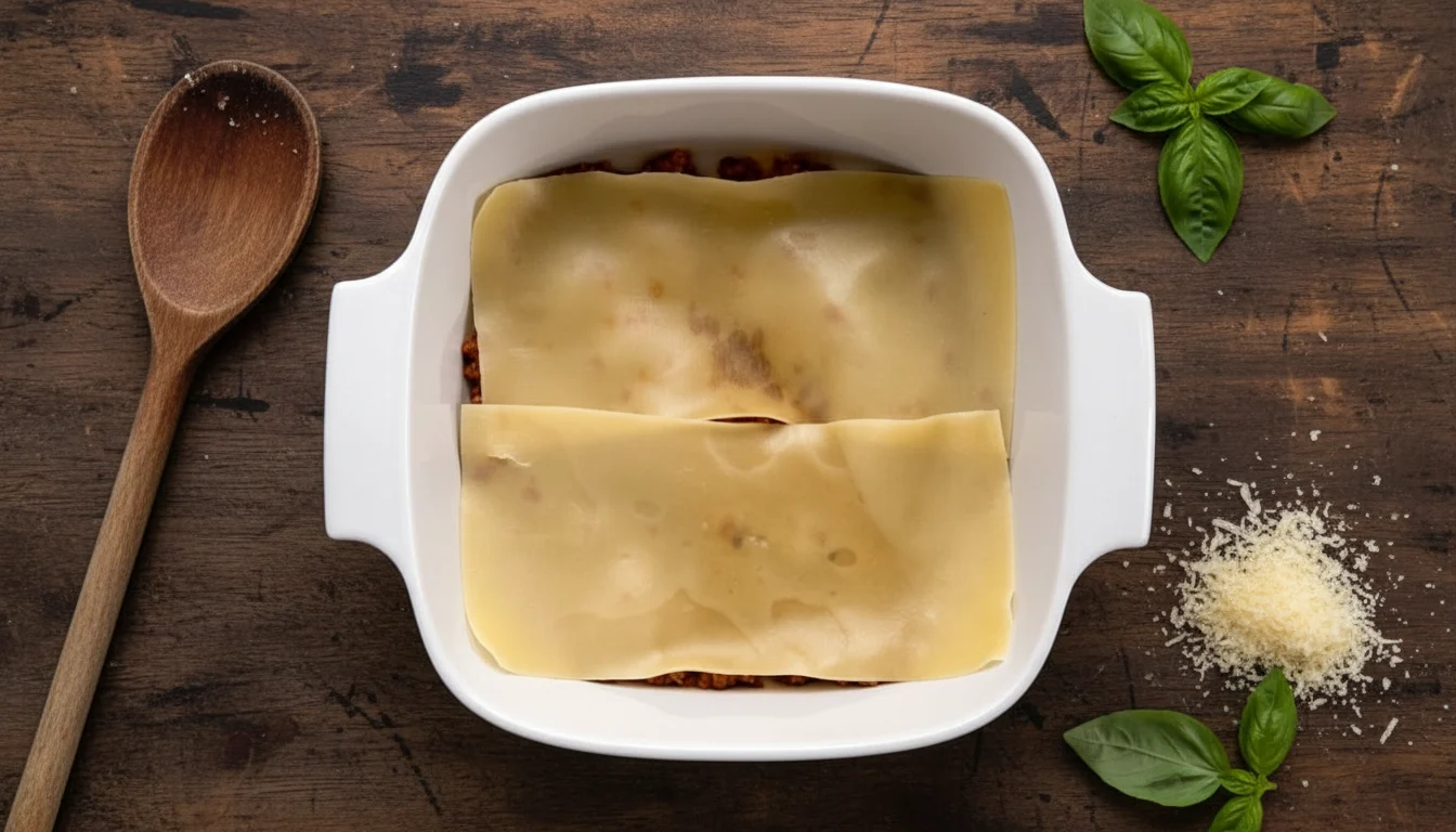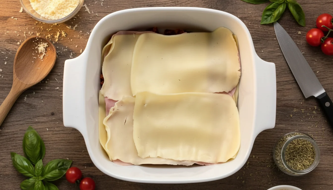 5. Em seguida, adicione uma camada da massa de lasanha. Se necessário, corte a massa para ajustar os espaços vazios.