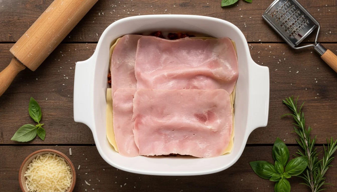 6. Depois, coloque uma camada de presunto sobre a massa.