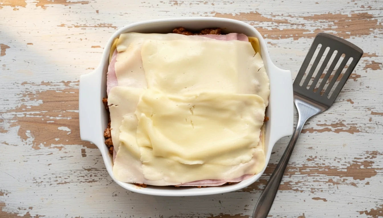 8. Repita as camadas: molho de carne moída, massa, presunto e queijo até que todos os ingredientes acabem, finalizando com uma camada de queijo para derreter por cima.