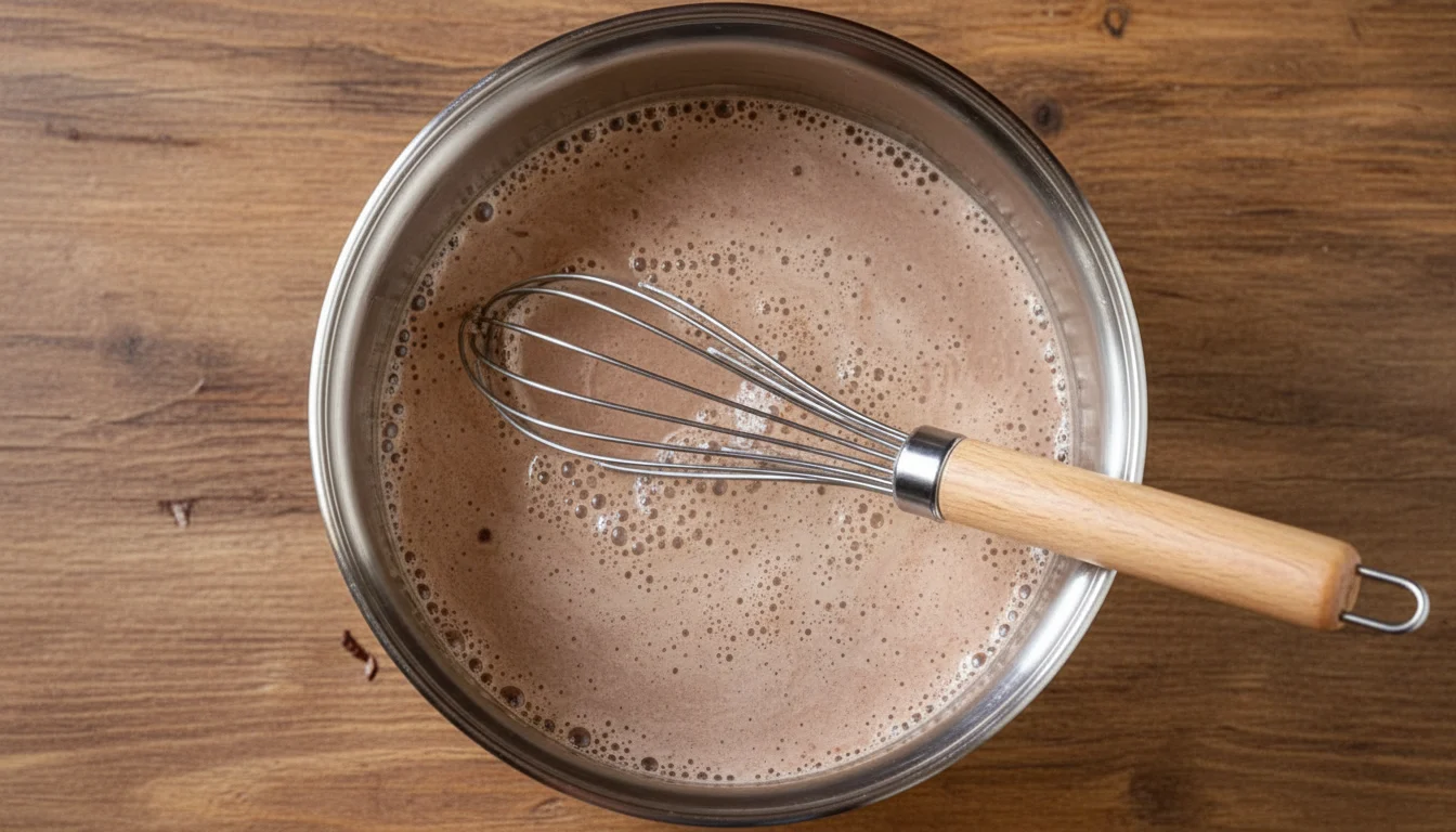 - Em uma panela grande, fora do fogo, misture metade do leite, o creme de leite, o chocolate em pó, o amido de milho e o açúcar usando um batedor até que tudo esteja bem combinado;
